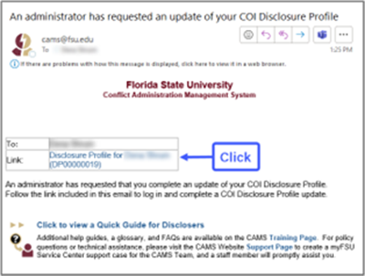 1. You will receive an e-mail from CAMS directing you to log into the system and complete your disclosure. Access your CAMS profile by clicking on the hyperlink in the message.