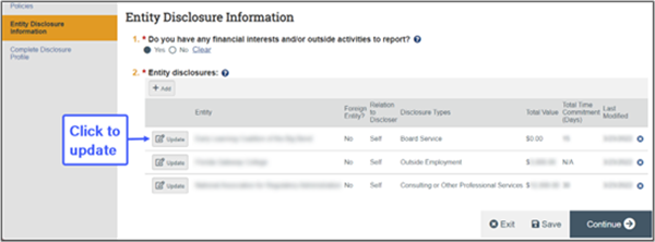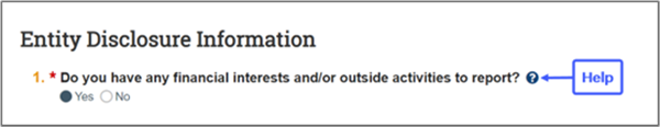 5. If you need to add a new activity or interest, scroll down to begin your disclosure process, beginning with Entity Disclosure Information (click “Yes”).  Use the help bubbles to obtain more information on each disclosure question as you move through the system.