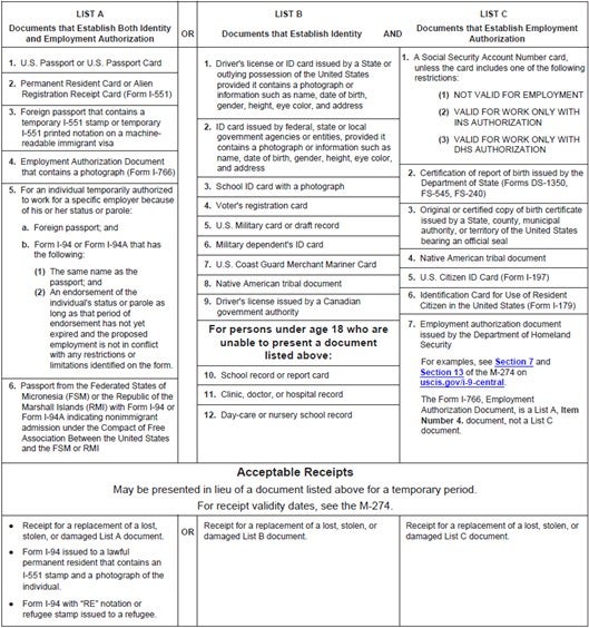 - One Document from List A - Documents in List A establish both identity and employment authorization.